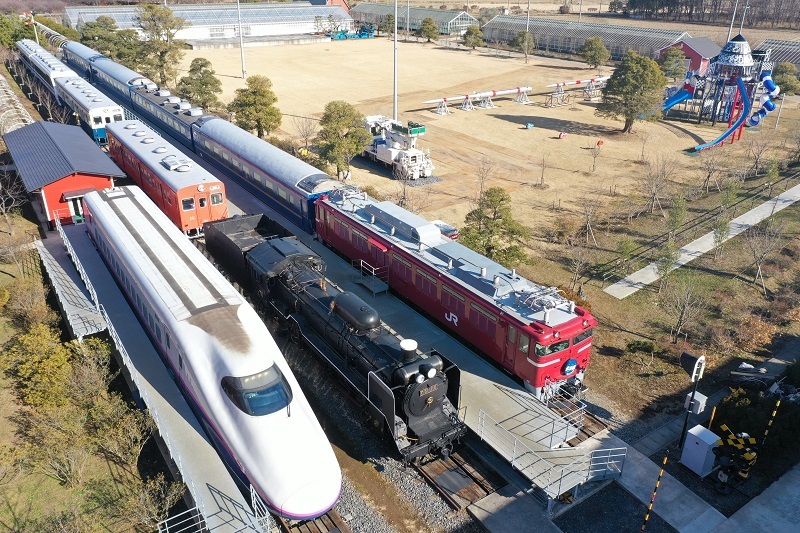 歴史に残る貴重な車両が勢揃い。蒸気機関車D51をはじめ、E2系新幹線、寝台特急北斗星(グランシャリオ(食堂車)・ロビーカー・寝台車2両(個室AB寝台車・B寝台車)の特急用24系客車4両、EF81型電気機関車)、地元で活躍した関東鉄道キハ101、102や鹿島臨海鉄道マリンライナーはまなす7000系気動車2両などが展示されている。