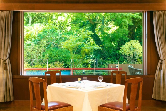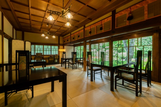 日本アルプスの高山植物636種が描かれた天井高6メートルの折り上げ格天井、欄間や柱にひそむさまざまな彫刻が、一皿への高揚感をいっそう高める。特別な空間で、創業当時のレシピを受け継ぐ洗練されたフレンチを楽しめる。