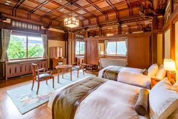 クラシカルな洋風建築の美しさを今に伝える宿泊棟。客室の窓からはテラスや箱根の自然が広がり、時を超えて愛される静謐な空間が広がる。洗練されたヨーロピアン調のデラックスルーム、趣のあるアンティークな家具や調度品が上質に映えノスタルジックな空気が流れるツインルームなど。